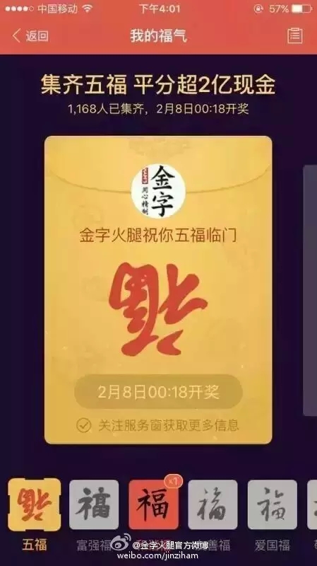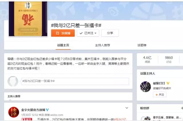 自前幾天支付寶將“集5福,搶2億+紅包”的活動(dòng)規(guī)則公布后,一時(shí)間,有關(guān)??〒Q贈(zèng)的話題強(qiáng)行霸屏。在有金字粉絲集齊了五福后,金字順勢(shì)在微博平臺(tái)上策劃的#我與2億只差一張福卡#的微話題就引發(fā)了高達(dá)4.6億的閱讀量,網(wǎng)友們通過點(diǎn)贊評(píng)論及轉(zhuǎn)發(fā)分享的方式,第一時(shí)間表達(dá)了自己對(duì)于五福??ê痛和?億紅包的高度期待!